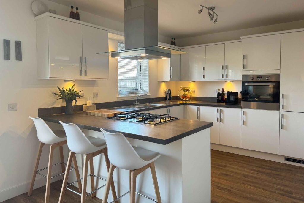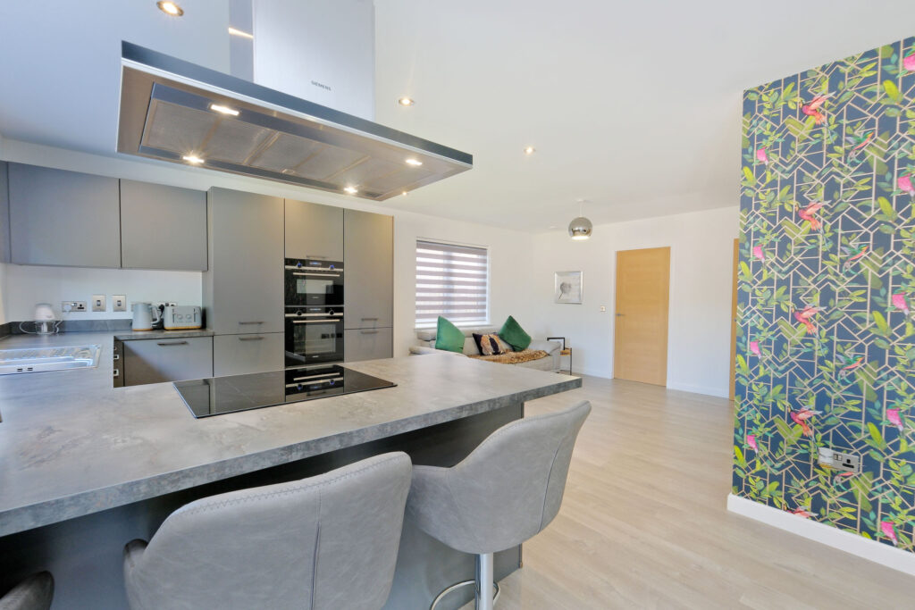 - Modern open plan kitchen equipped with a breakfast bar and larger dining area